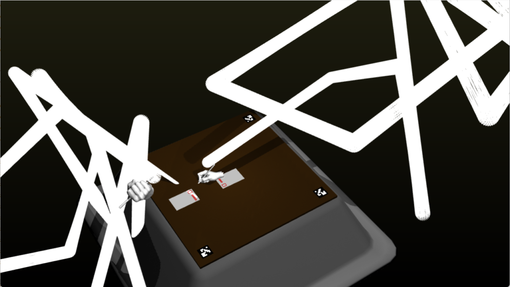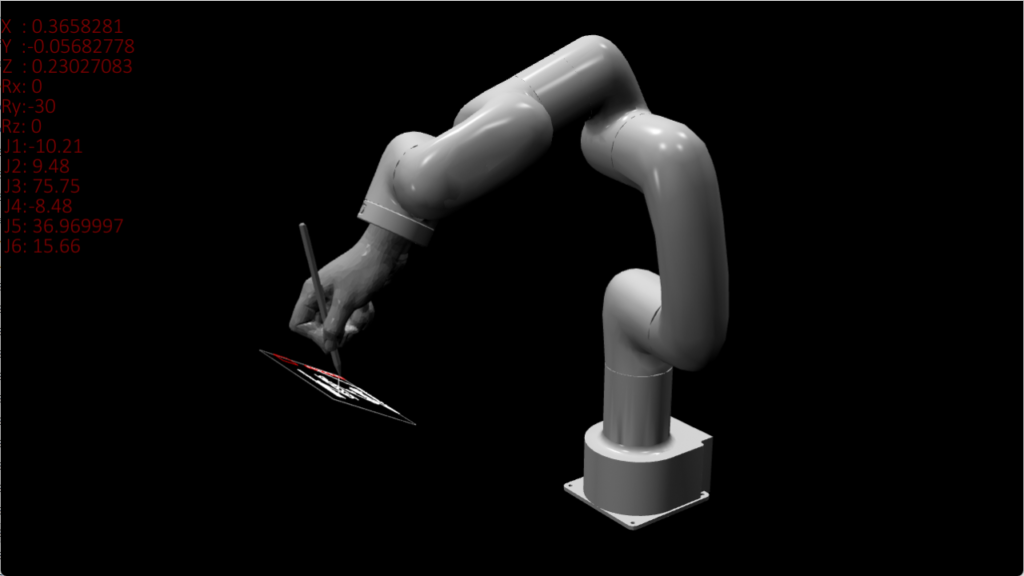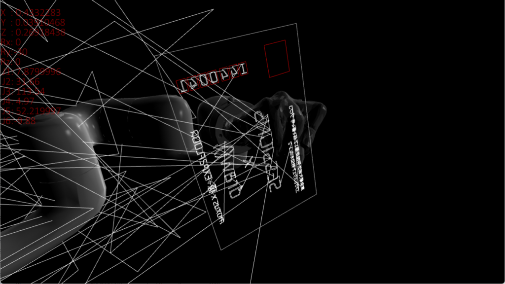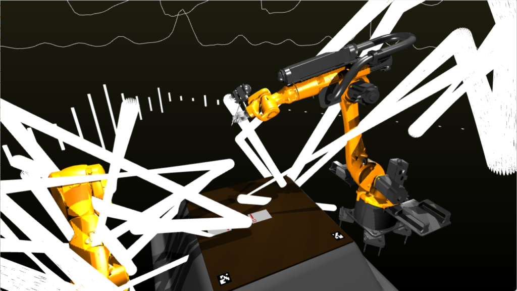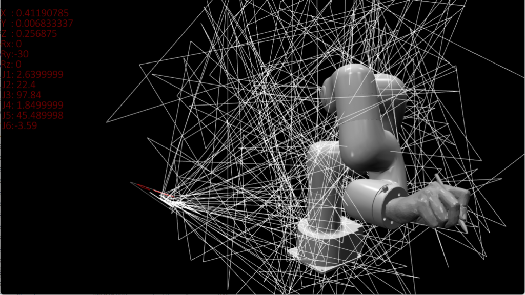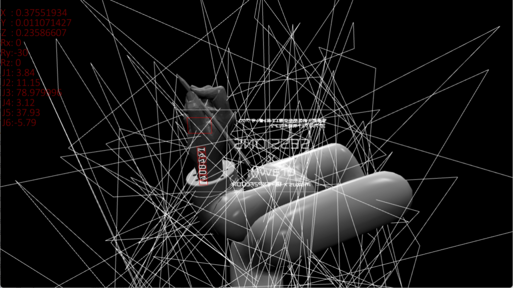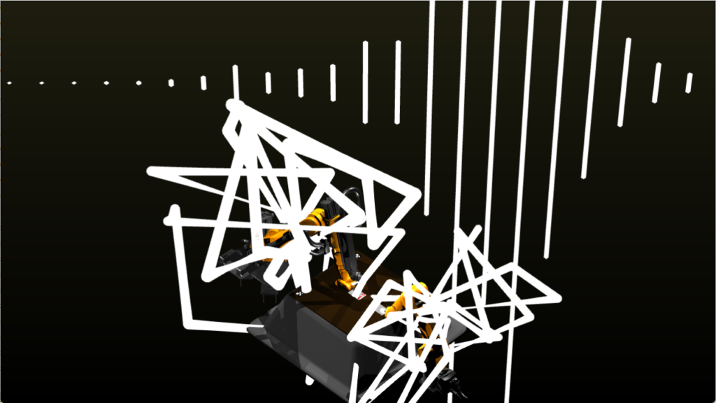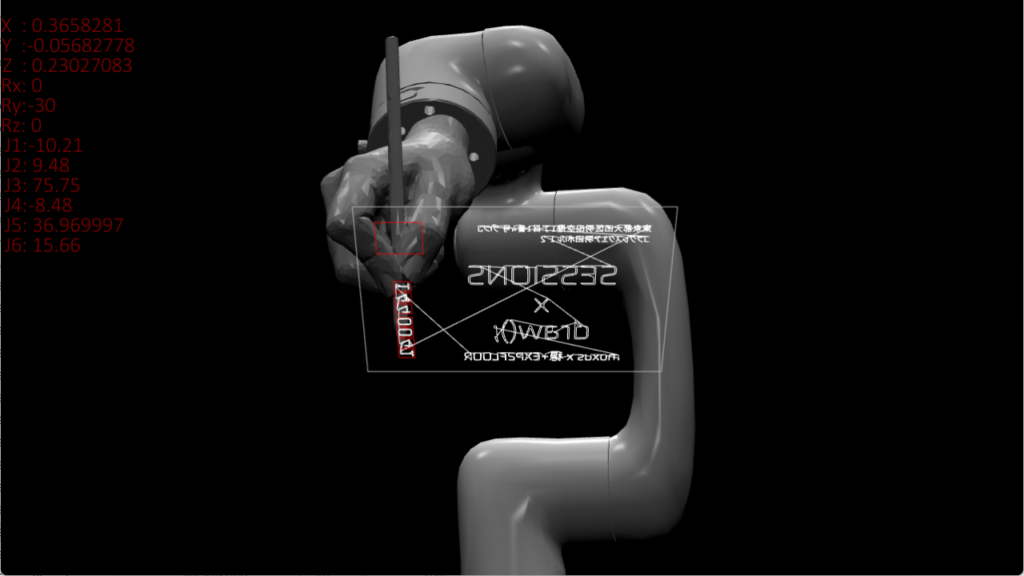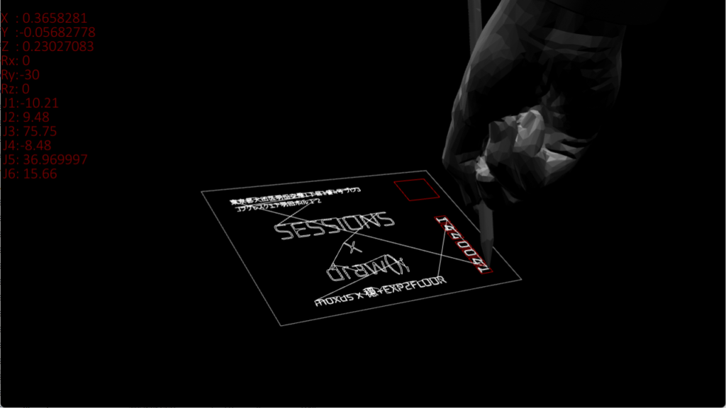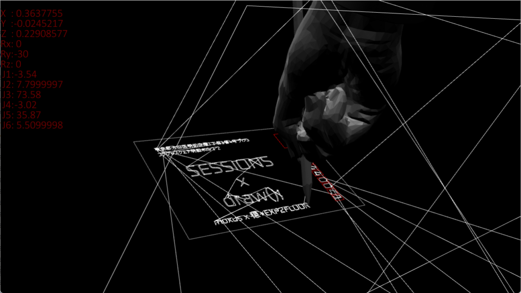 リアルタイムにロボットの姿勢計算を行い、ロボットに文字を書かせるシミュレーションや、各軸の挙動を制御して空間に模様を描くなどdrawingをテーマに映像を展開するほか、音でシミュレータをバグらせることで演出を加えました。