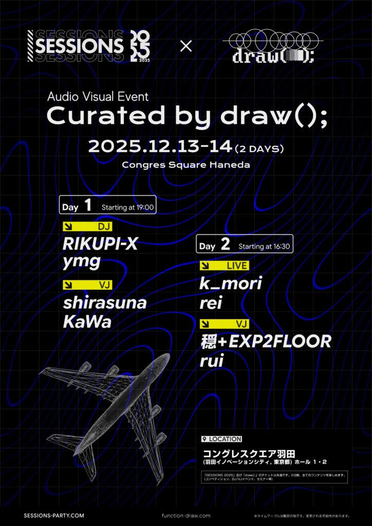 2025年12月に開催されたオーディオビジュアルイベント『Seesions × draw(); #2』にてVJを行いました。